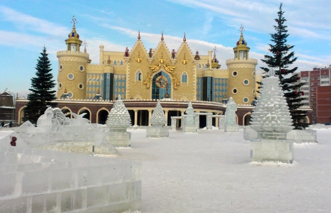 Если вам не досталось билетов на кукольные представления в дни каникул (они, по традиции, в дефиците), не унывайте! Вы сможете хорошо провести время и не заходя в театр, ведь на площадке перед «Экиятом» стоит впечатляющий размерами и красотой ледяной городок с горками и лабиринтом, который не разочарует маленьких посетителей. Самые большие и захватывающие дух горки здесь платные (25 рублей за возможность один раз скатиться). Отсюда рукой подать до Парка Тысячелетия, где устанавливается главная городская елка. Заодно можно будет и ее посмотреть.