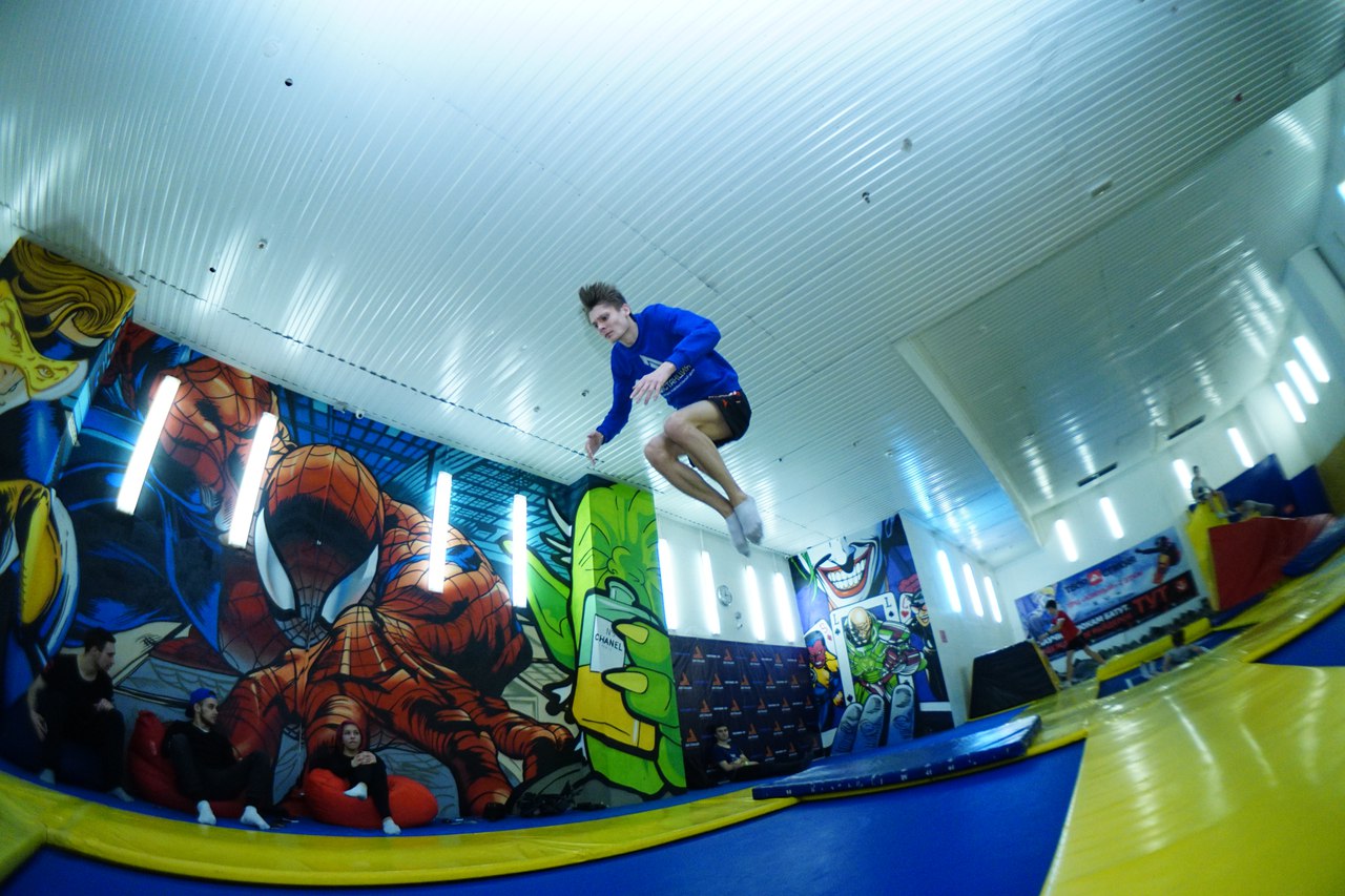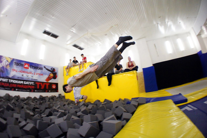 Центр находится на первом этаже комплекса FUN24. В просторном зале установлен десяток батутов различных размеров и покрытий, также есть мягкая стена для прыжков и разноцветный «поролоновый» бассейн. Для удобства гостей оборудованы раздевалки и мини-бар. Наличие последнего вы обязательно оцените по завершении тренировки, пить хочется неимоверно.