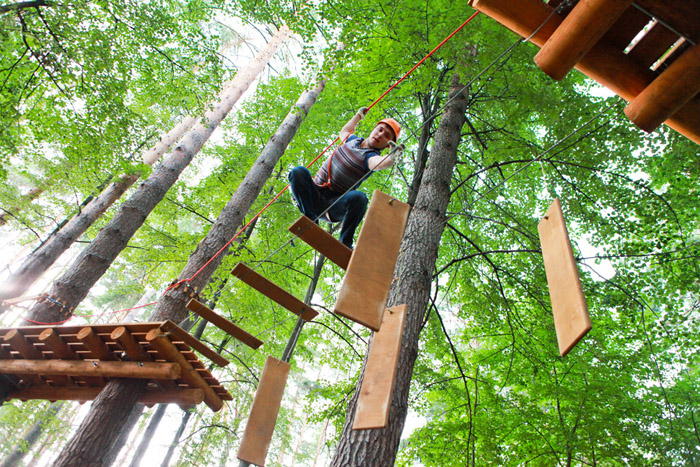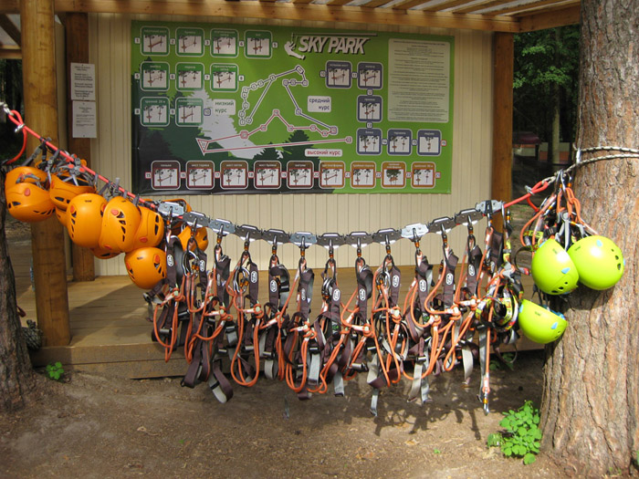 Для прохождения маршрутов вас «упакуют» в надежную систему страховки с обвязками и каской. Обязателен вводный инструктаж, удобная одежда и обувь, хорошее физическое самочувствие – отнеситесь к этому серьезно, парк действительно экстремальный. Тут вас ждут многочисленные веревочные переправы, прыжки с высоты и ходьба по канату.
