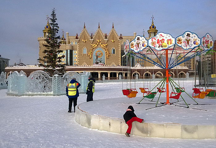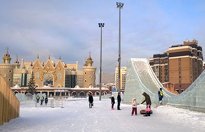 ПЛЮС Зимой на площади перед «Экиятом» работает открытый парк аттракционов. Его украшают искусно вырезанные изо льда фигуры Деда Мороза, Снегурочки и других сказочных персонажей, здесь установлена елка, есть несколько горок разной высоты. Можно прийти на площадку со своими салазками и воспользоваться общедоступной инфраструктурой, или взять на прокат тюбинг (150 рублей за 30 минут) и забраться на самую высокую горку – около 8 метров. В «теплый» зимний день здесь можно покататься на лошадке или пони, сфотографироваться с ними, купить воздушные шары и сладкую вату.