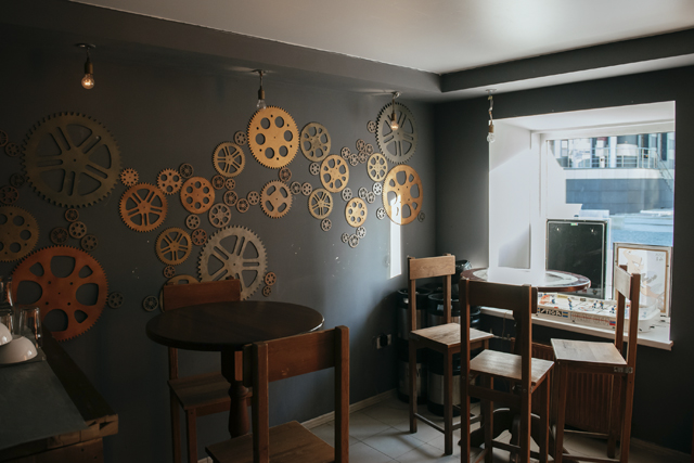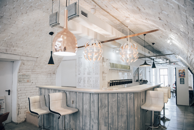 Дизайн бара продолжает скандинавскую концепцию прошлого помещения — белые кирпичные стены и свод, яркие акценты, много солнечного света и светильники оттенка «розовое золото», которые сейчас являются трендом.