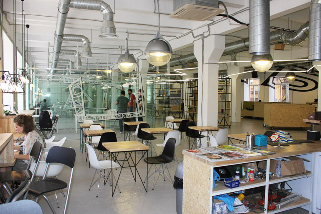 Технопарк и коворкинг «Авиатор» открылся в декабре прошлого года в не самом очевидном месте — Авиастроительном районе. Расположение кажется действительно неудачным: без карты в смартфоне не обойтись, и от метро путь довольно неблизкий — в том числе, и по территории, похожей на промзону. Интерьер «Авиатора» выполнен в основном в бело-синей гамме и пестрит интересными деталями — яркими диванами, граффити на стенах и необычными люстрами. Формат пространства, в принципе, схож со «Штабом», который я описывала выше: здесь тоже есть небольшое кафе с обеденной зоной, «переговорки», офисы постоянных резидентов и коворкинг.