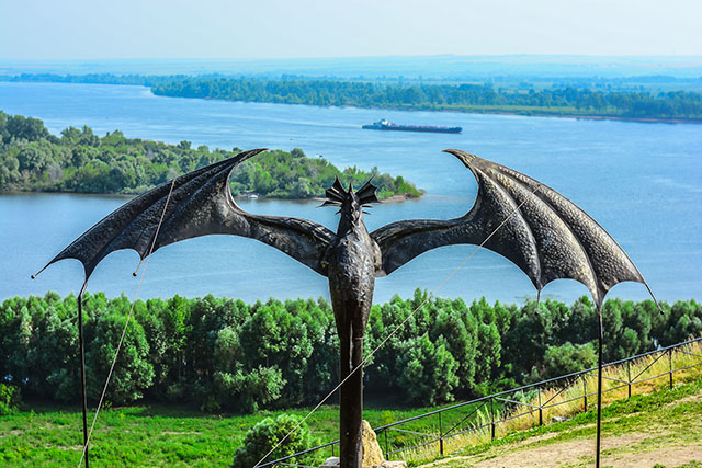 Мы идём дальше и, обогнув дракона, охраняющего вход в комплекс, направляемся к башне. Дракоша хорош. Злой оскал, широкий размах крыльев. Со спины кажется, будто он осматривает свои владения, сидя на высочайшей точке города. Всем он хорош, кроме трубы- основы, растущей из туловища. И, что ещё грустнее, канатов, которыми он закреплён. Они не убираются в несколько штрихов ни в одном мобильном фоторедакторе, я проверяла. Кажется, что этот дракон, как и вся история тех времён, угодила в сети и никак не выберется.