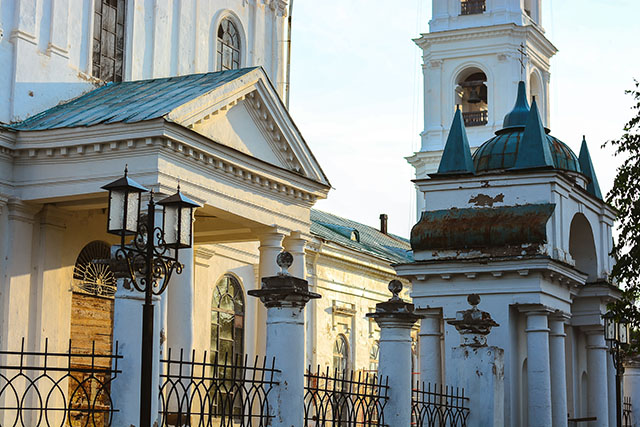 Над Шишкиными прудами возвышается красивая старинная церковь. Поднявшись к ней, мы обнаруживаем, что она на стадии реконструкции: уже невыносимо ярко блестят новые купола, по белоснежным стенам отчаянно пытается незаметно пробежать паучок. Но она же ещё хранит на фасаде сбитую частями лепнину, деревянные ступеньки входа, помутневшие от времени стёкла в окнах – и напоминает старушку, которую застали в момент преображения. Мне нравится, когда старость естественна – как у людей, так и у зданий. Церкви дальше по улице пока не могут похвастаться ремонтом и получают в разы больше моего внимания.