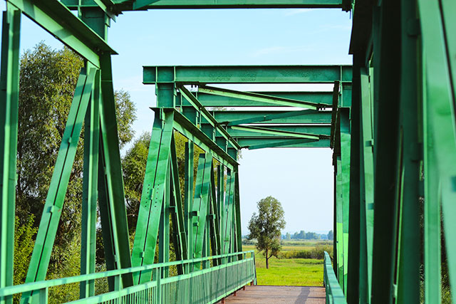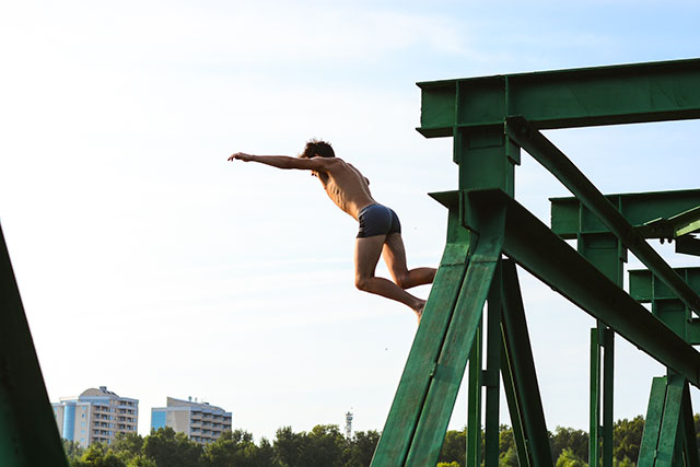 От прудов до ближайшего намывного острова тянется тяжёлый мост, напоминающий железнодорожный. Здесь в воскресенье аншлаг – дети на спор прыгают с перил и даже с верхних ярусов моста в мутную воду реки. Зеваки сходятся и расходятся, а компания ребят продолжает свой отдых.
