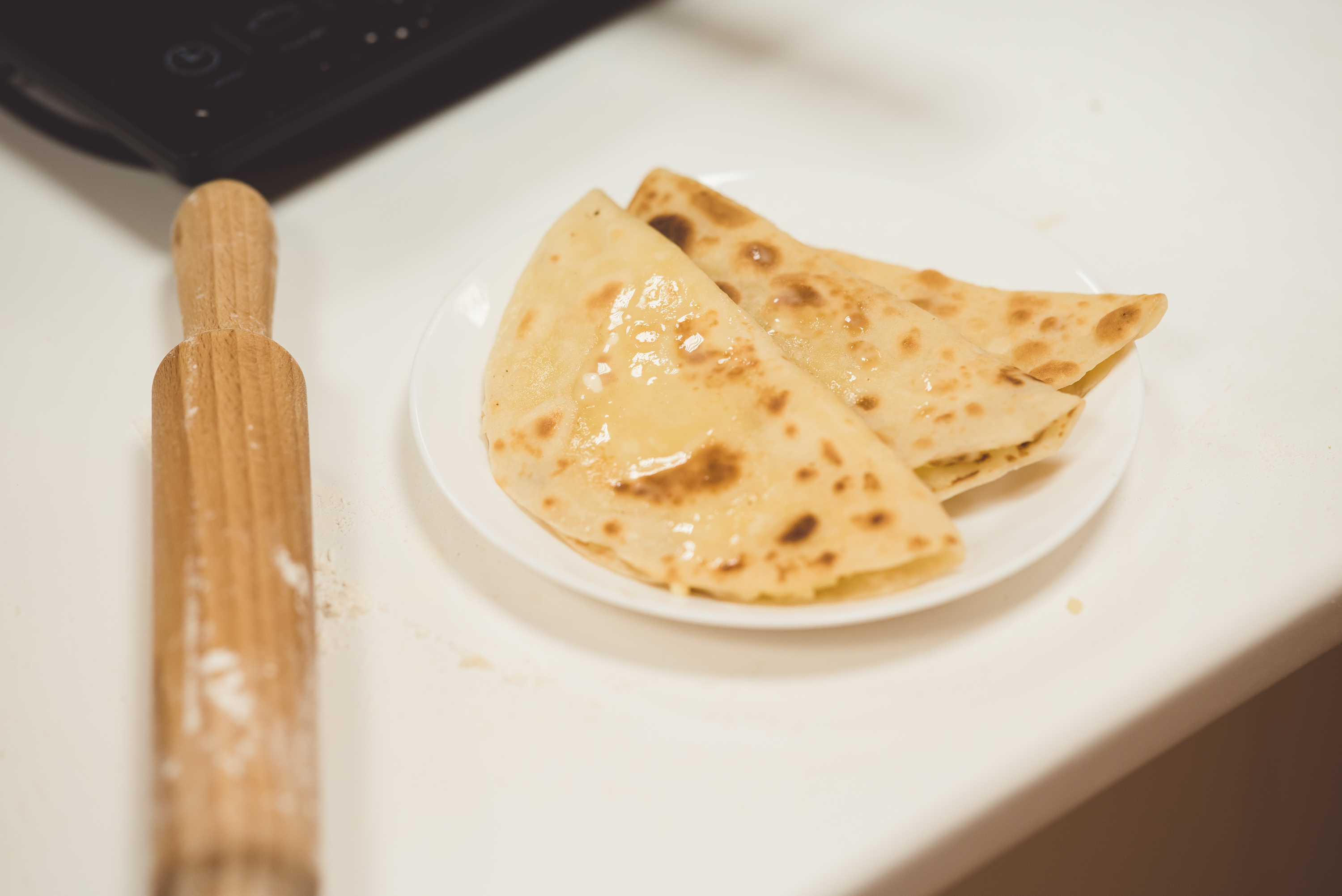 Элеши отправляются в духовку, со стола как по волшебству исчезают следы рабочего процесса, и появляются новые заготовки: мука, сметана, масло… А мы, не теряя времени, берёмся за кыстыбый. Темп задан, и мы быстро управляемся с замешиванием теста и формированием юка – тонких лепёшек, слегка обжаренных на сковороде без масла. На этом моменте я узнаю лайфхак, которого ждала с детства, и, не дождавшись окончания мастер-класса, звоню маме, чтобы им поделиться: обжаренную юка нужно сразу сложить пополам, чтобы она не ломалась при наполнении начинкой!