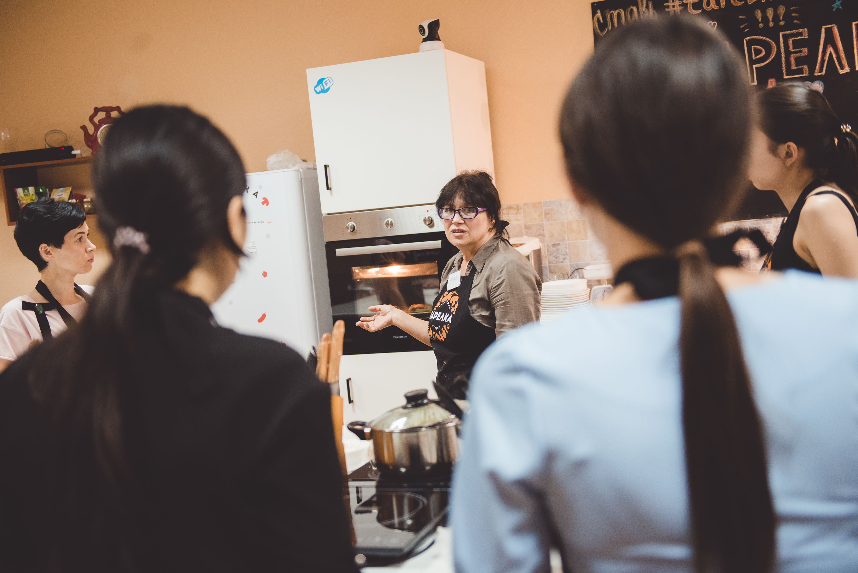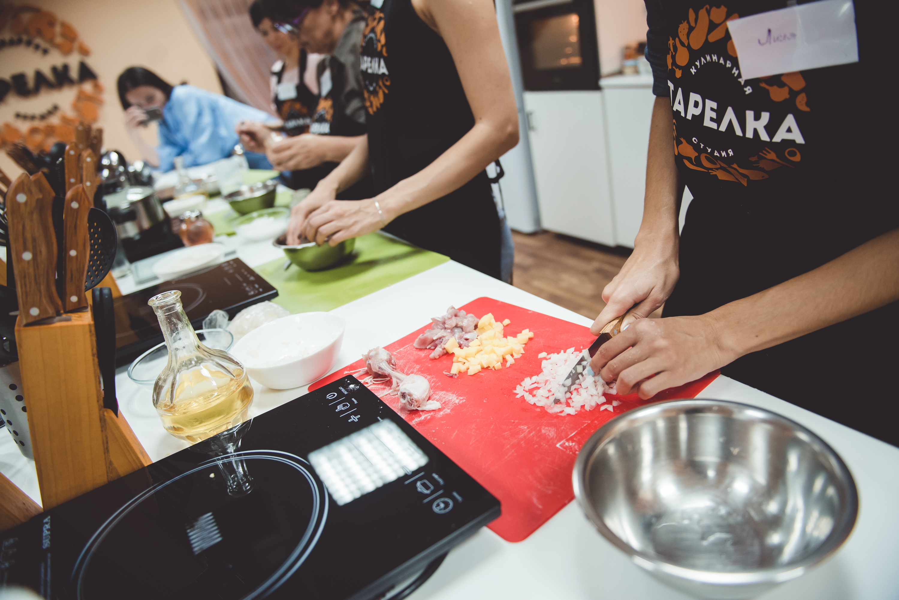 За рабочим столом напротив – другие ученицы студии. Старше и младше меня, опытные кулинары и начинающие любители. Все, как одна, хотят порадовать родных: родителей, мужей, женихов и детей. Шесть вдохновлённых хозяюшек в фирменных фартуках переминаются с ноги на ногу в ожидании начала, в последнюю минуту вбегает ещё одна участница прямиком из Ульяновска, и меня охватывает ощущение, что нас ждёт очень хороший вечер. И что их заинтересованные горящие глаза вдохновляют больше, чем ослепляющий свет софитов на любой кулинарной телепередаче.