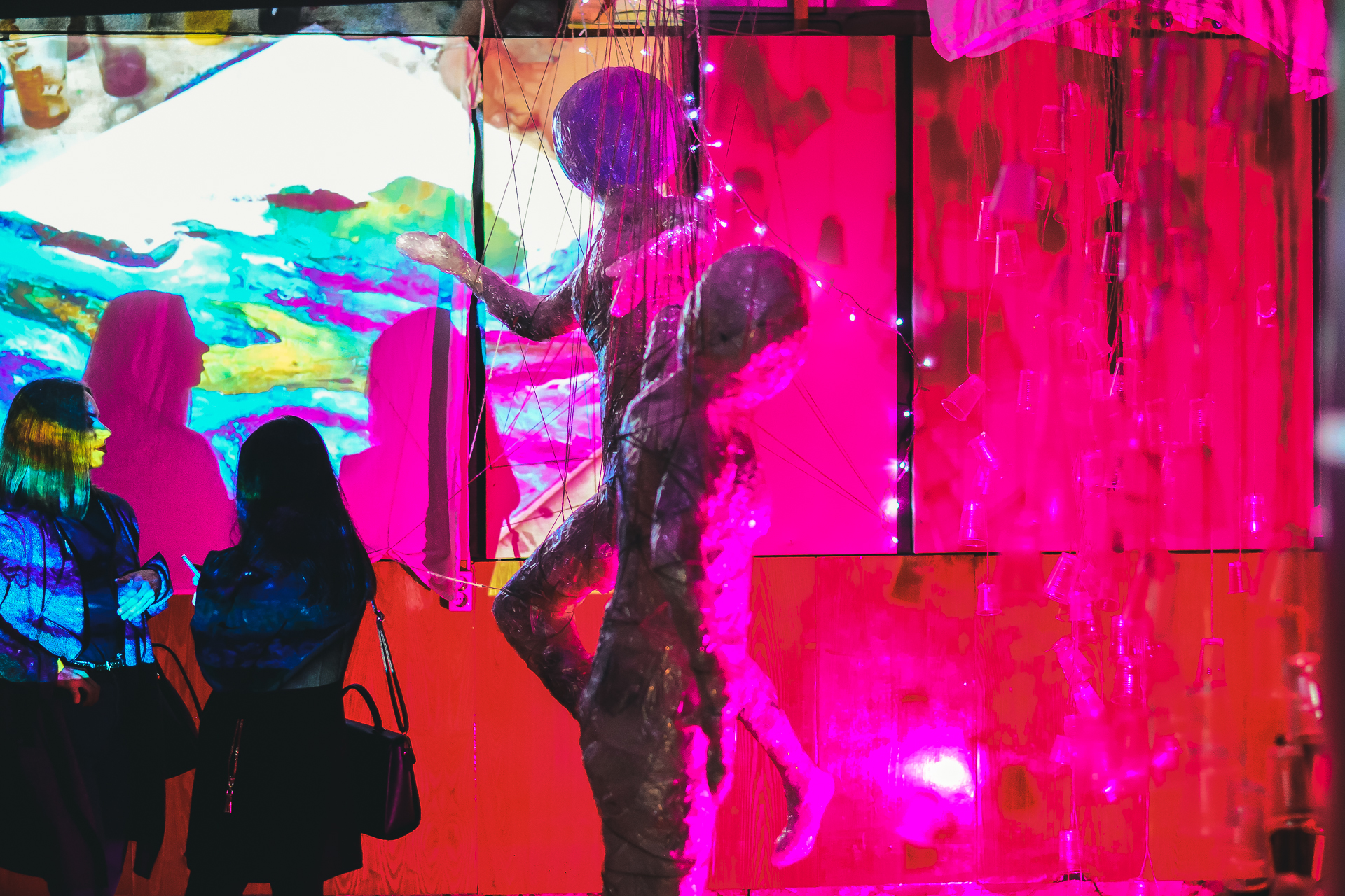Чем дальше, тем больше провокационных работ. Все комнаты – это композиция из элементов пространства и вещей. Непривычно обустроенные залы, подвешенные манекены, яркий и контрастный свет, все предметы меняют свою привычную функцию. Но они всё равно остаются реальными объектами с фактурой и тенями, которые обыгрываются смыслом.