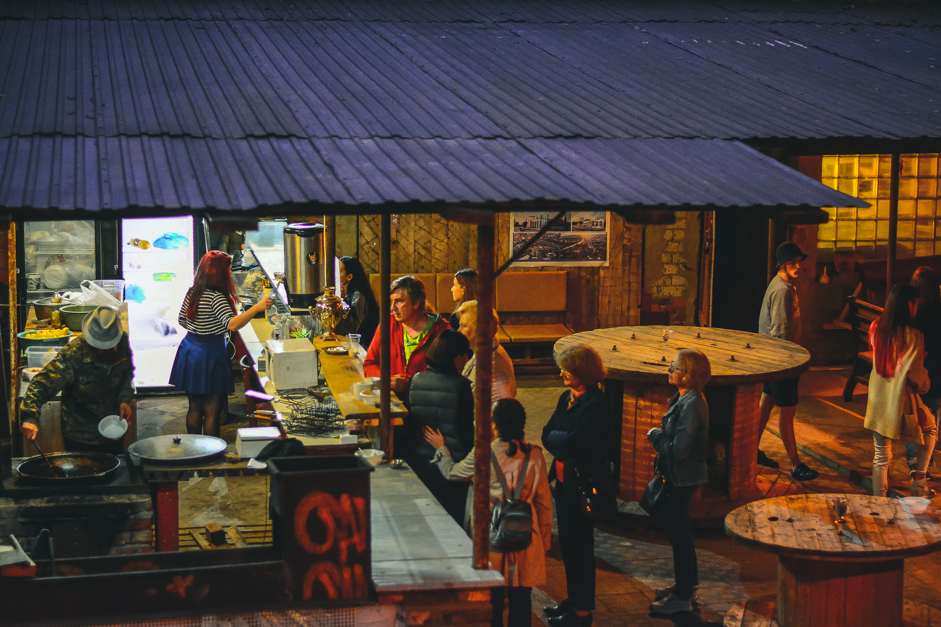 И вот на улице уже стемнело, людей становится больше, зажигается свет, играет музыка. Самое время подняться на крышу и взглянуть на ночной город. Сверху видно всю площадку, весь контраст происходящего. Тут всё, от тонко одетых дам до байкеров. Все эти люди вряд ли бы встретились в обычной жизни, но здесь они все вместе, делятся впечатлениями и находят удовольствие в общение друг с другом. Внизу растянулся уютный фудкорт, где всё очень вкусно и по-домашнему. В день города организаторы не лишили гостей удовольствия насладиться салютом и вечеринкой, продолжавшейся до самого утра.