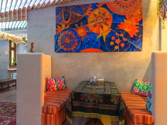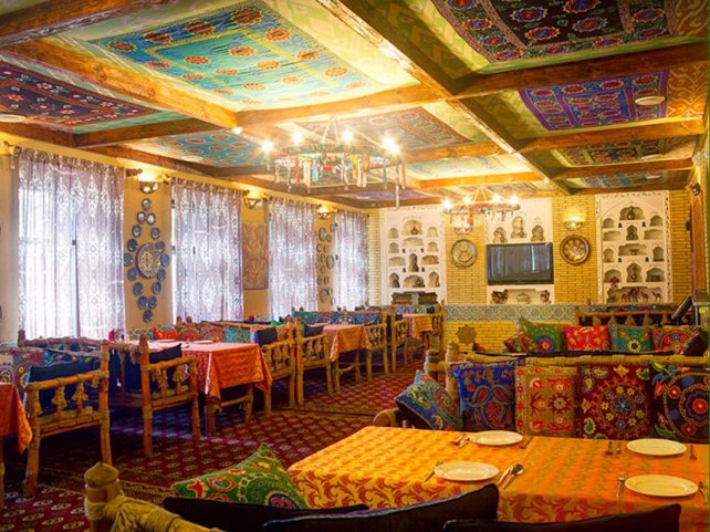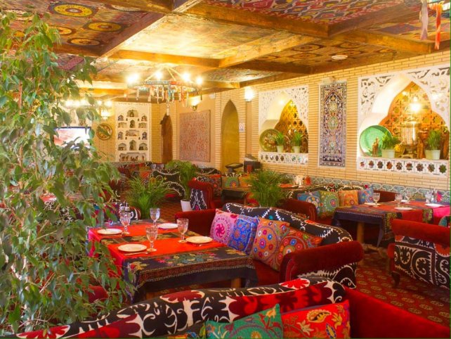Завлекает посетителей блестящей вывеской на перекрёстке двух улиц: Амирхана и Чистопольская. Но внутреннее убранство я охарактеризовала бы как «простенько и со вкусом». Узбекские мотивы на стенах, резные узоры на ножках столов, подушечки, ковры – и на этом, в принципе, восточное убранство заканчивается.