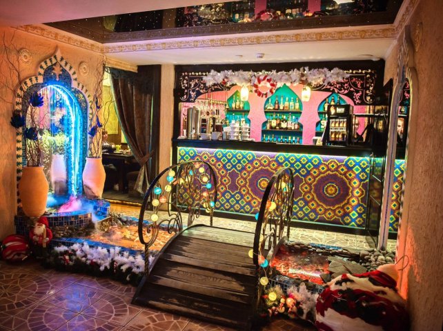 Антураж: официантки одеты в восточные одежды. Заведение состоит из небольших комнат-шатров. Иногда в ресторане проходит выступление с танцами живота.