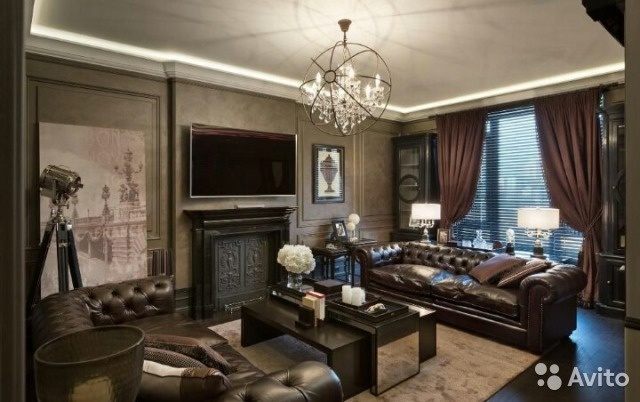 Зал этой квартиры отлично подойдёт для важных совещаний или просмотра хоккея с друзьями – по трём сторонам комнаты стоят диваны и кресла, а посередине – огромный шкаф-стенка с маленьким телевизором, похожим больше на планшет. Игру вы, конечно, не увидите, но полюбуетесь лицом рядом сидящего друга.