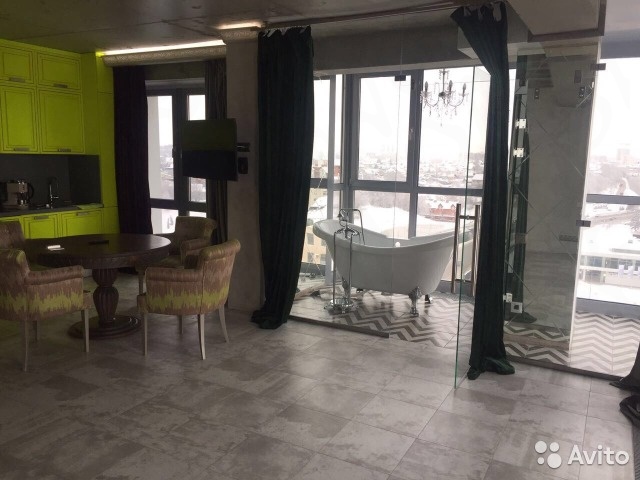 Эта ванная с панорамным окном стала самой популярной ванной в инстаграме. Знаменитые казанские фотографы проводили там фотосессии для всех желающих. Поэтому, если и вам понравилась такая фотолокация, то есть возможность снять апартаменты на несколько часов. Если же финансы позволяют снять её на более длительный срок, то вам крупно повезло. Вместе с апартаментами прилагается консьерж, смена белья каждые три дня, уборка, и по необходимости вам могут приготовить командировочные документы. Так что если командировка, то в Казань.