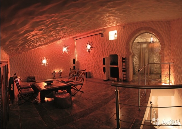 Любители кальяна, ликуйте. Двухэтажная четырёхкомнатная квартира с джакузи на первом этаже и комнатой для кальяна на втором. Мини-кальянная похожа на соляную пещеру в восточном стиле с окошечком на потолке. Дизайном квартиры занимался декоратор московской школы «Детали» (она же и хозяйка).