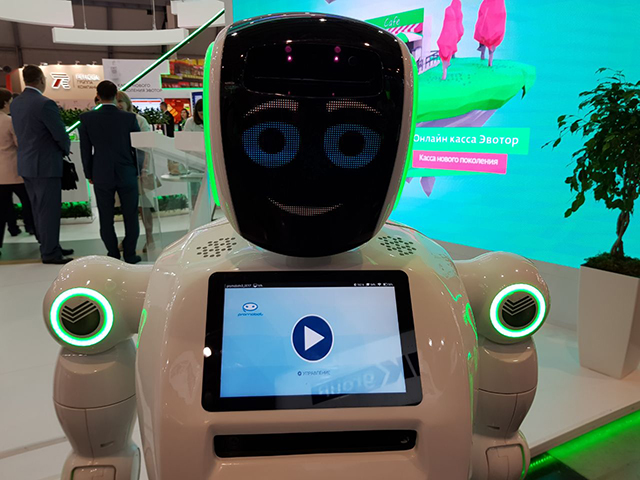 Гостей стенда Сбербанка на «Иннопром» встретили «умные» роботы - Сбертроник и Кибернетик. Если первый отвечал больше за развлекательную программу: пел песни, поддерживал любые беседы и рассказывал анекдоты о гаджетах, то второй давал подробные инструкции, как обезопасить себя от интернет-мошенников. Оба робота умели распознавать лица с помощью биометрических технологий.