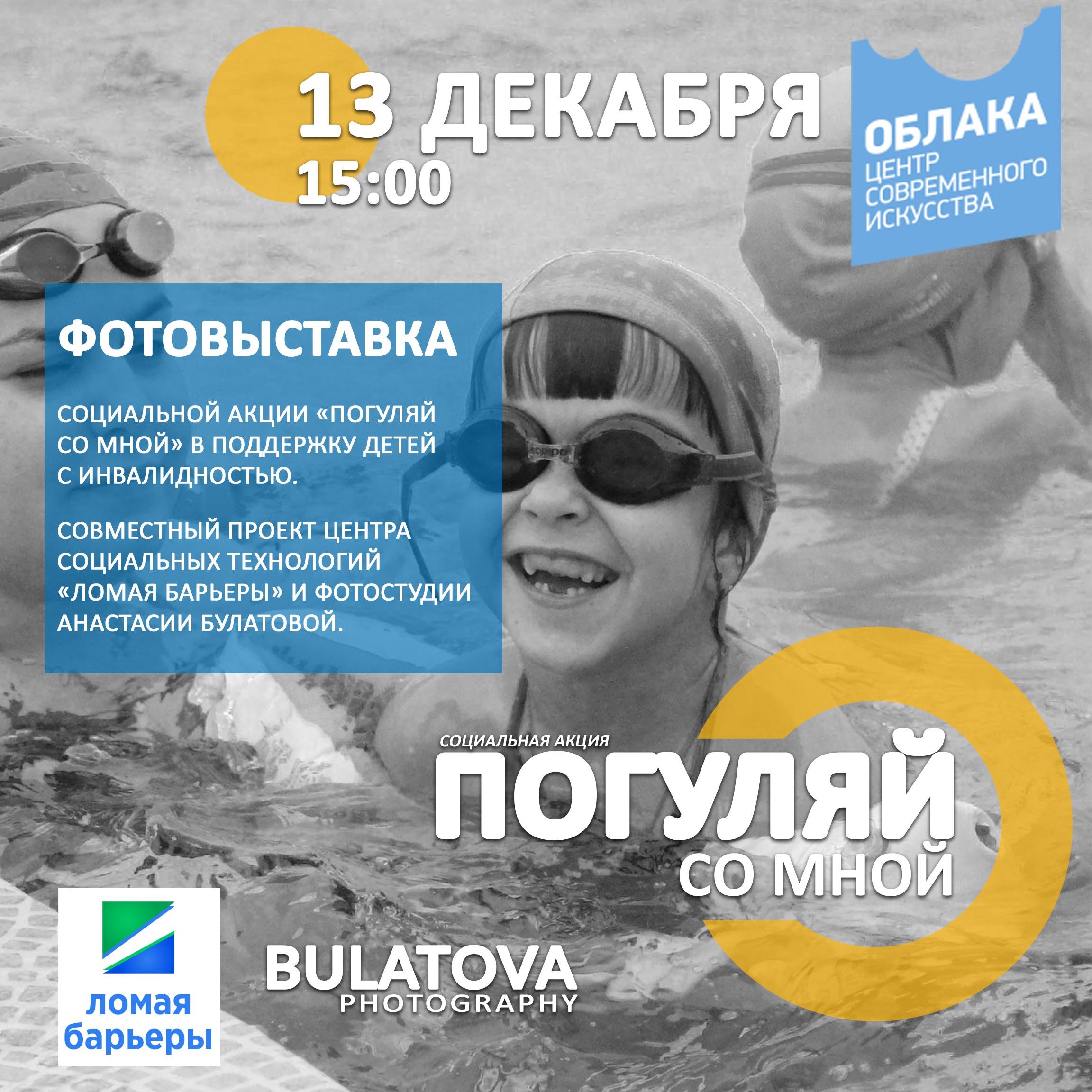 Фотовыставка в ЦСИ «Облака» станет результатом совместного сотрудничества фотостудии Анастасии Булатовой и социального проекта «Ломая барьеры». На снимках посетители увидят моменты посещения детьми Театра оперы и балета, Филармонии и Русского драматического театра, а также музея занимательных наук «Интеллектус», аэропорта «Уфа» и многих других объектов. Сопровождающими для детей-инвалидов стали министр семьи, труда и социальной защиты РБ Ленара Иванова, начальник УГИБДД по РБ Динар Гильмутдинов, заместитель министра здравоохранения Рамиль Хамитов, Антон и Виктория Макарские, паралимпийская чемпионка Оксана Савченко.