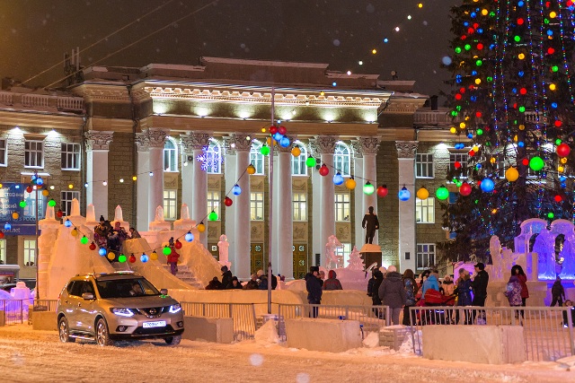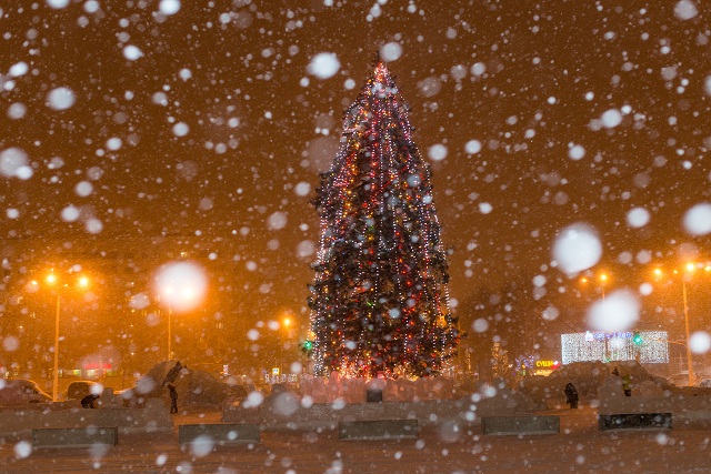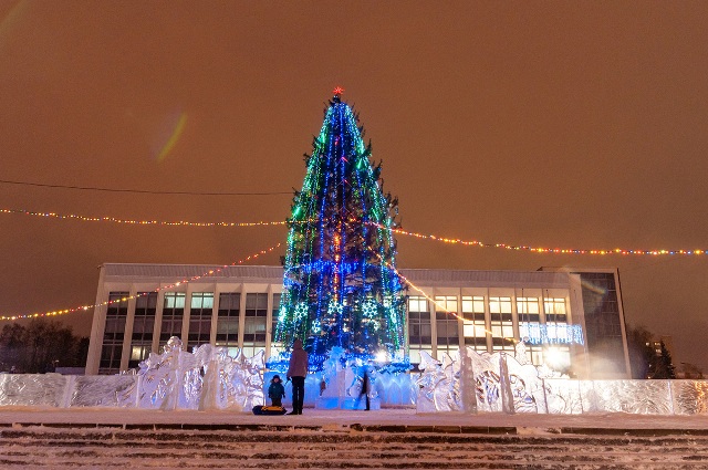 Очень красиво смотрится, если подниматься к ней по улице Первомайской. Огоньки сияют в просвете шикарной еловой аллеи. Весь ансамбль площади радует глаз и, если убрать суету, пробки и выхлопы автомобилей, можно поймать ощущение, что попал обратно в детство. Елка настоящая, много гирлянд, шариков.