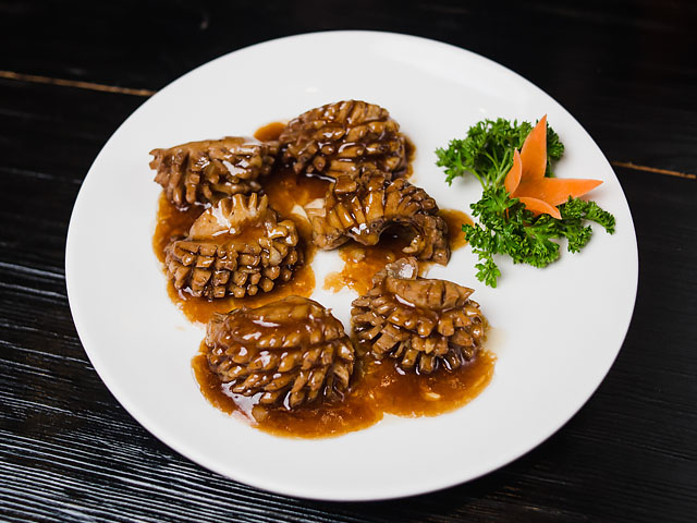 Здесь должна звучать барабанная дробь, как в цирке, когда акробат под куполом и без страховки! Потому что мне несли бычьи яйца в соусе абалон. На самом деле, это реальные яйца реального местного быка. В одной порции одно здоровое яйцо, разрезанное на 7 кусочков. Выглядит, как убитый и вывернутый наизнанку ёжик. По сути, это мешочек, мясо упругое, белое и на вкус – как очень нежная курятина. Неожиданно крутой неповторимый вкус. Кстати, это не какой-то специально обученный китайский бык, а совершенно местный с башкирской фермы. В связи с чем у меня вопрос: почему этот деликатес совершенно не используется в национальной башкирской кухне? Которая, не брезгуя, использует потроха животных, но куда они тогда девают яйца? Почему не готовят пирожки с бычьими яйцами, тот же бялеш? Может, в Китай экспортируют? В Уфе за порцию 520 р.