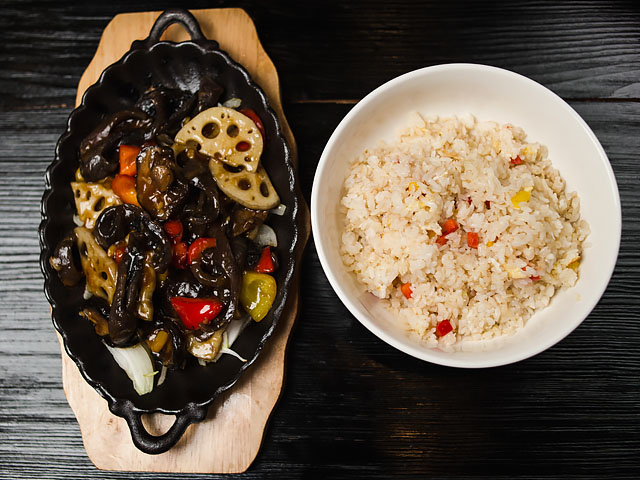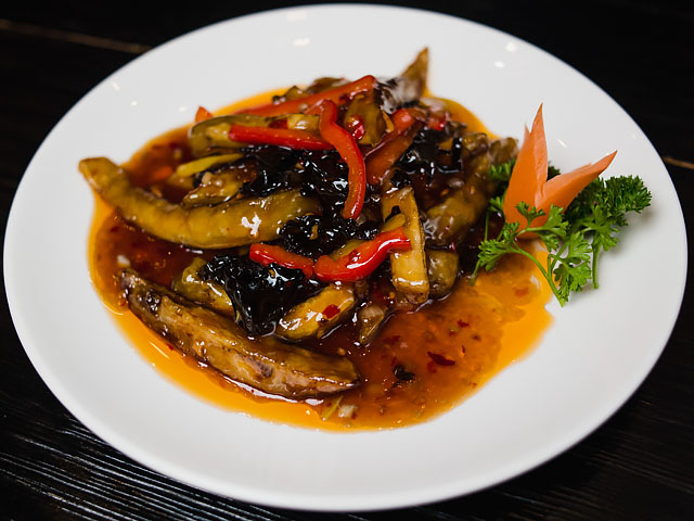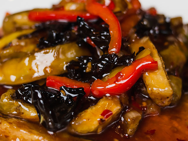 Ещё один божественный вариант, за которым здесь целая очередь из китайцев – баклажаны в кисло-сладком соусе. Я очень люблю баклажаны, но я никогда не ела их в такой подаче. Они томно-сладкие, хрустящие снаружи и очень мягкие, пюреобразные внутри. Доводят их до такой кондиции во фритюре, а подают в миксе из болгарского перца и чёрных грибов. Совершенно баклажанный вкус, сама фактура продукта доведена до совершенства. Лучшие баклажаны в городе здесь за 380 р. На гарнир к ним закажите тарелку риса с яйцом (обычным яйцом!). Кстати, здесь отменно готовят рис! В порции аж 400 грамм!