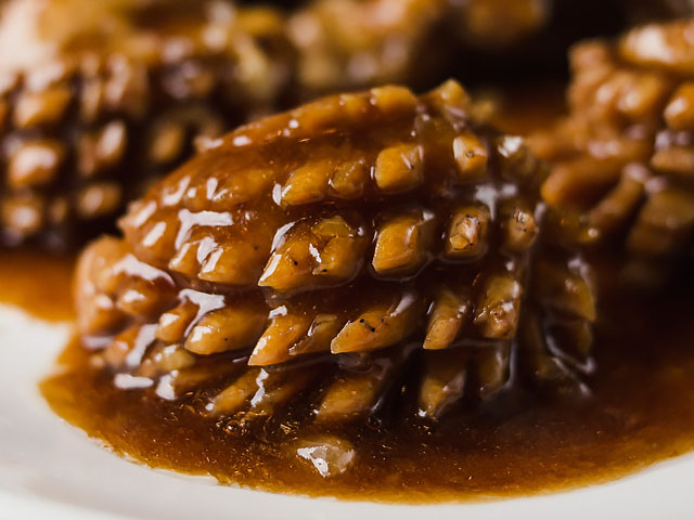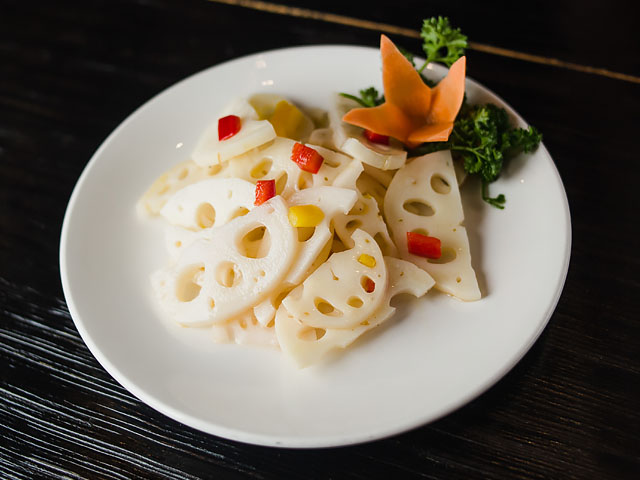 Снять стресс после встречи с трепангом мне помог салат из лотоса. Корень лотоса хрустящий, сочный, сладковато-пряный. Эта подводная часть растения считается деликатесом во всём мире. Маринованный корень лотоса орехоносного считается непревзойдённым блюдом из национальной японской кухни. На вкус как маринованное яблоко-репа, если бы такой фрукто-овощ вообще существовал. 350 р. за 120 грамм.