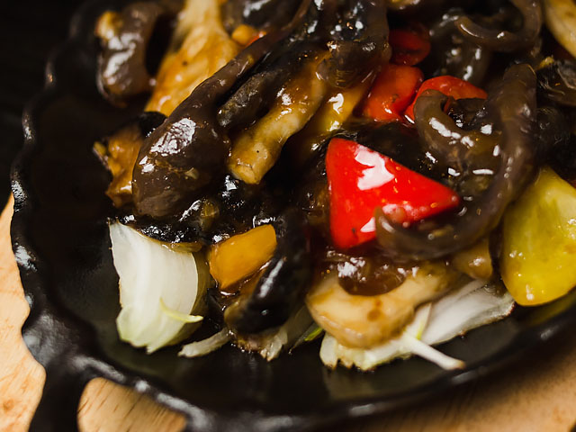Да-да, самый настоящий трепанг на сковороде. Это такое морское животное типа иглокожих, напоминающий мягкий хрящ. По своим лечебным свойствам считается морским женьшенем. У него невероятное количество полезных свойств – от омоложения организма до улучшения работы головного мозга. Говорят, китайцы едят его – только шум стоит. Может, поэтому они такие шустрые и «сделали» весь мир. 1390 р. за много-много трепанга на сковороде.