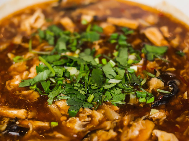 Остро-кислый суп очень хорош! Вот супы у китайцев неплохие! Насыщенные, там много всего, не разберёшь, что ешь – много приправ. Очень многогранный вкус – от кислого к острому, с курицей, яйцами (обычными, не тысячелетними и не бычьими), чёрными грибами, томатами и зеленью. Кстати, китайцы добавляют зелень во всё – набор из петрушки и кинзы сопровождает почти каждое блюдо. Этот суп похож на борщ с курицей, но вкус нежнее и острее. Для наших морозов отличное спасение и, мне кажется, эффективная профилактика гриппа. За большую тарелку, наполненную до краёв – 330 р.
