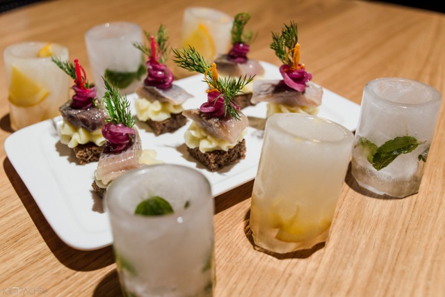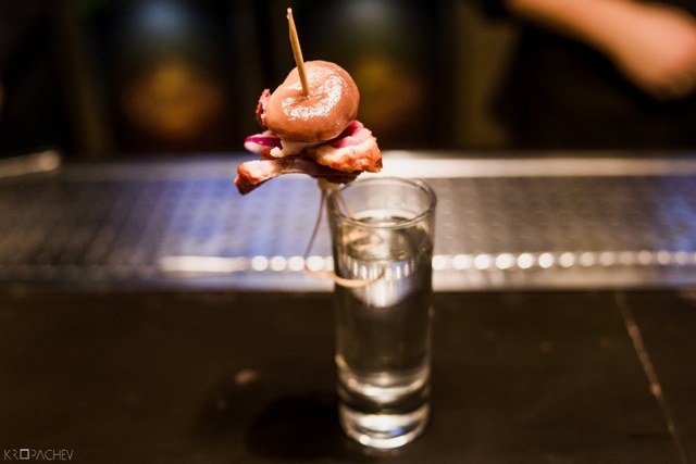 Нам принесли шот изо льда и классическую закуску, но в очень удобной форме. Канапе из черного хлеба, пюре, кусочка селёдки и лука. Выдохнул, выпил и разом закусил всеми классическими ингредиентами. Удобно и вкусно! Но у меня остался один вопрос к ребятам: как вы додумались к селёдке и луку подать клюквенную водку? Диана, это ты выбирала?!