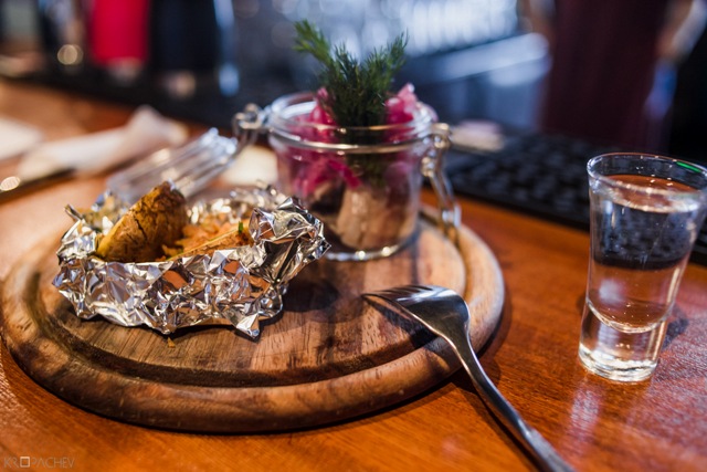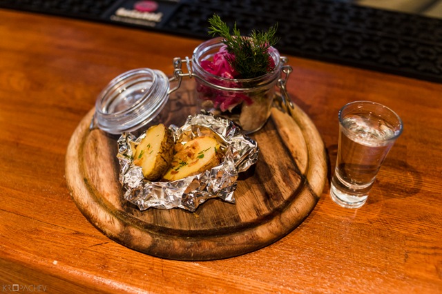 К рюмке слегка прохладной водки (я такую температуру считаю лучшей) мне подали в банке «из-под варенья» селёдочку под маринованным лучком, а партнёром к ней – запечённая картошка в фольге. Классика жанра! Как сказал мне бармен Марат, раз уж мы в Сипайлово, локация обязывает закусить традиционно. А я не против. К тому же, картошка и лучок были отменными, и лишь селёдка слегка пересоленная.