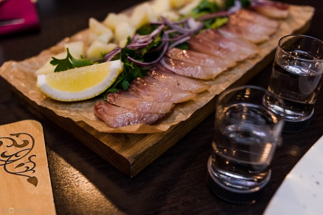 Я почти не чувствую вкуса муксуна. Попробовал больше соуса – нет, не то. Бородинские чипсы классные, но с пивом я бы их полюбил больше. Позже мне пояснили, что эта закуска экспериментальная, и ещё обсуждается, стоит ли её вводить в меню. По мне, эксперимент не удался. Возможно, эту закуску спасет тёплая водка. Кстати, употребляющим в меру – не бойтесь пить её теплой. Она тоже имеет право раскрыть свой вкус. Да, дамы, у водки есть вкус!