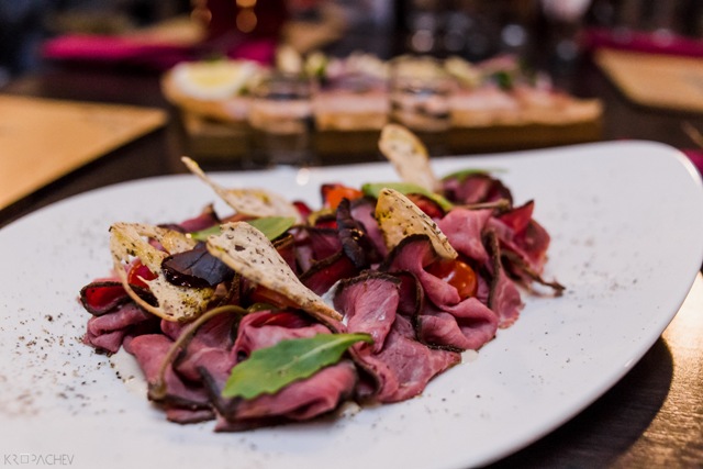 «Вино и сыр». Заведение, явно не специализирующееся на водке. Ресторан с очень уютным интерьером. Представьте: вы пришли, но вы не любитель вина. Как я. И вот, озадачиваете официанта закуской к рюмке водки. Какой ответ у винного ресторана? Брускеты. Неявная для меня закуска, специально к водке я бы их не попросил. Но они были очень вкусные – хрустящий ароматный хлеб, маленькие кусочки маринованного перца и нежное мясо. Вот только готовили эти чудо-бутерброды целых полчаса. И это при том, что посадка была от силы на треть ресторана.