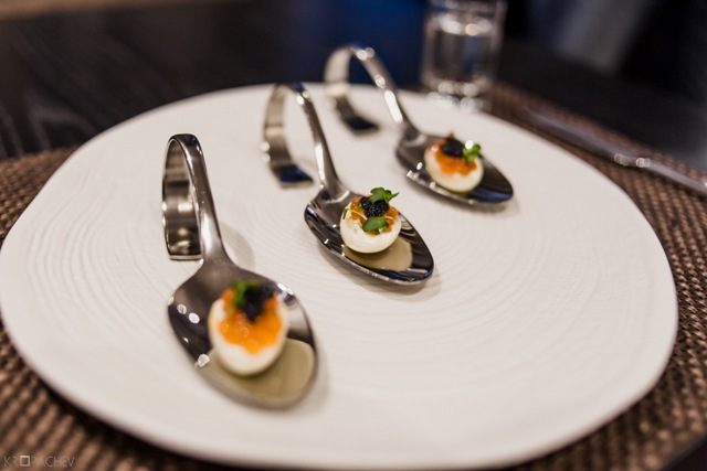 Вот и она. Да, подача соответствует заведению. Половинка перепелиного яйца, на ней красная икра, третьим этажом щучья икра, подкрашенная, видимо, чернилами каракатицы. И три-четыре крошечных веточки кресс-салата. Выдохнул, выпил, закусил. Вот так да! А закуска оказалась просто супер! Забегая вперёд, скажу, что это фаворит моего обзора. Икра щуки отлично смягчила вкус красной икры. Повару респект!