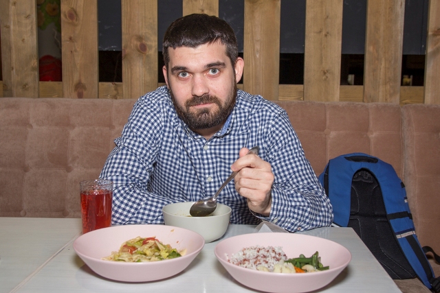 «Я живу прямо рядом с Хурмой и поэтому иногда завтракаю тут, а моя девушка работает в УралСибе на Революционной. Когда я заезжаю за ней, то коротаю время за чаем в Буффете. Если после этого мы едем куда нибудь, то можно и кофе попить с вкусной сладостью. Я уже много лет не ем мясо и в выборе заведения для завтрака, обеда и ужина является важным объем вегетарианского меню. В Буффете почти всегда есть овощной суп, большой выбор тушеных овощей и круп, и, конечно, свежие овощи, которые можно набрать по своему желанию. Вкусный и не дорогой чай с мятой или облепихой. Когда на кассе мне говорят цену 200-300 рублей за полноценный обед, я приятно удивляюсь».