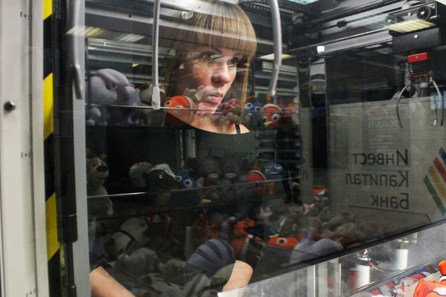 Если у вас есть дети или девушка, перед которой хочется блеснуть хваткой, можно потратить несколько сотен на попытки поймать мишку в этом адском аппарате. Это филиал Лас-Вегаса в Уфе, конечно. Все так просто – навел манипулятор, куда тебе нужно, и схватил зайку, который обязательно выскользнет и упадет в груду плюшевых сирот. А ты суешь в приемник еще один полтинник, потому что это же так легко! Я никого, разумеется, не словила. А вам когда-нибудь везло?