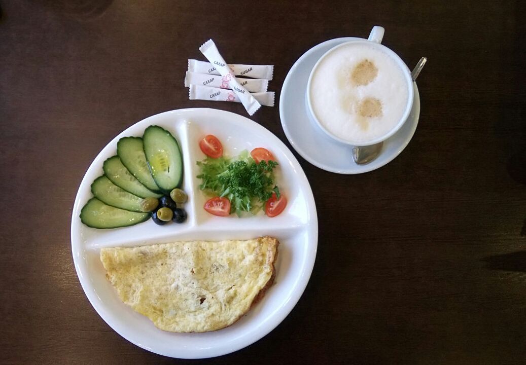 В 10 утра (именно во столько начинает работать кинотеатр), как уважающая себя богема, я еще не завтракала. До первого фильма было полчаса, поэтому пошла в «Шербурские зонтики», чтобы поесть. Здесь есть приличный набор утренних блюд, поэтому долго металась. В итоге остановилась на омлете, сырниках и большом капучино – ударила по белку. Жду свой заказ, а пока раскладываю ноутбук и осматриваюсь.