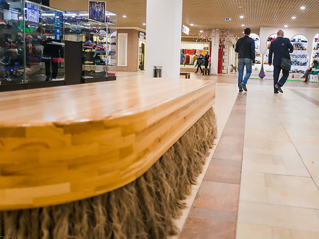 А.В.: Нет, это всё создавали сами. Все перегородки с резьбой изготавливались также в Уфе. Это самая живая зона торгового центра. Раз чувствуется, что тут больше людей, чем на других уровнях, чуть более шумно, значит, наш базар получился.