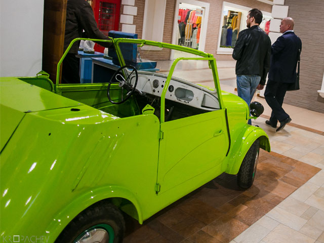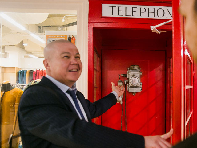 А.В.: Ну да. Здесь есть ключевое слово – ценность. Есть люди, которые создают ценности. Здесь ценность создать очень трудно. Торговый центр – это посредник между покупателями и продавцами. Вроде какую ценность можешь создать? Освещение хорошее сделал, свежо, чисто. Что ещё можешь дать? Мы решили пойти дальше. Вот подошёл отец с сыном к ретро-автомобилю, показал машину, рассказал, как он служил. Таким образом, через этот объект мы передаём следующему поколению свои чувства, свои мысли. Это же ценно! Это наш лайфстайл. Вот эта будка. Сюда приезжают молодожёны и фотографируются (телефонная будка, стилизованная под классическую английскую).