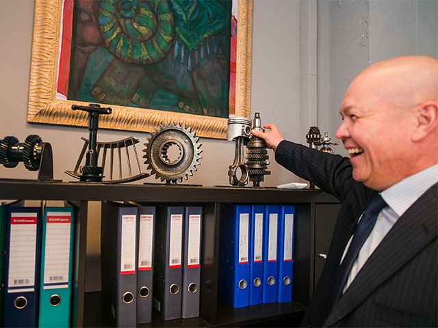 Артур Валерьевич позволяет нам заглянуть в свой офис. На полу ковролин, и нас в порядке исключения пускают в обуви. Небольшое пространство с кучей самых разных объектов. Представьте себе содержимое гаража. Всё отмыть, слегка отреставрировать и аккуратно расположить в пространстве. И вот у вас офис, как у Хазигалеева. Почти.