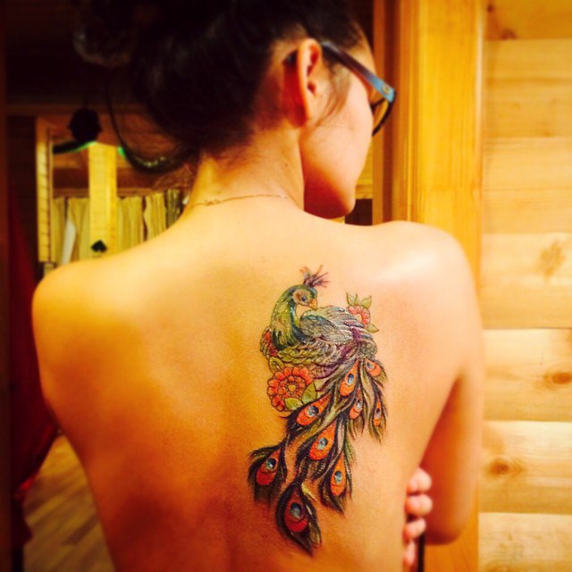 Очень хотелось птицу. Когда я выбрала картинку, тату-мастер сказала, что ее можно бить либо на руке - на внутренней стороне локтя, либо на щиколотку, а это слишком видные места. Я спросила у мастера - что можно набить на спину. И тут я увидела павлина. Вы бы видели как загорелись глаза мастера, оказывается она мечтала ее набить уже три года.