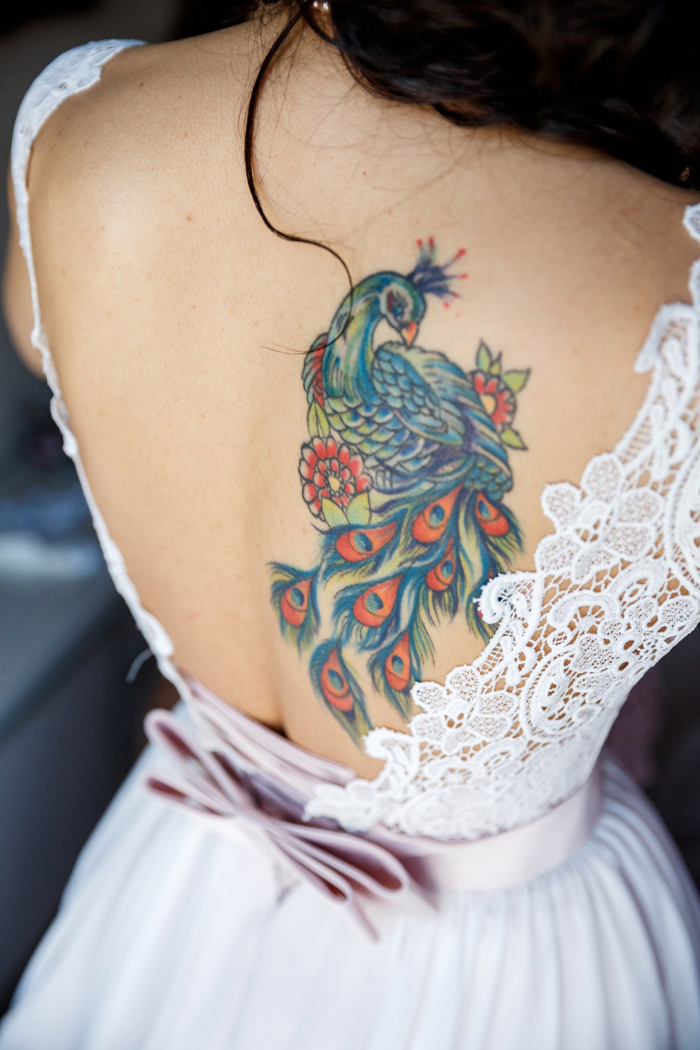 Я влюбилась в эту эффектную птицу. И даже не задумывалась, что она на четверть спины. С ней я хожу уже три с лишним года. До сих пор не уверена - жалею ли я, что сделала ее. Очень беспокоилась о том как будет смотреться со свадебным платьем. Сейчас замечаю ее только выходя из душа.