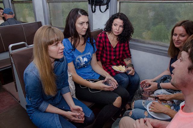 Мы сели на электричку. В последнем вагоне пришлось переселить девушку, чтобы занять две скамьи – девушка, извините нас. Попробовали договориться с кондуктором, чтобы не мешала нам работать на благо журналистики – ответ был расплывчат. Тревожно резали сыр в ожидании контролеров. Когда в окнах поплыли вагоны, решились открыть первую бутылку. Ирина говорит: «Первым надо открыть шампанское!» Это было плохим решением, потому что от жары шампанское разыгралось не на шутку и выстрелило пробкой в потолок вагона. Мы надеемся, что никому не попало. Треть бутылки оказалось на полу. Черт бы нас побрал с этой идеей. Наши громкие голоса и орудийные залпы стали привлекать внимание пассажиров и главный редактор обреченно объявил: «Ребята, высаживаемся в Деме. Отставить разговоры, я не хочу, чтобы вас скрутили».