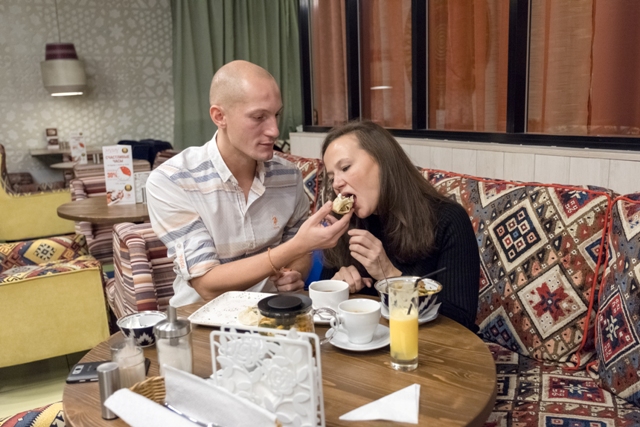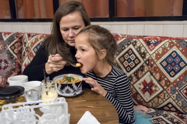 Попрощались с Италией и добро пожаловать в «Халву». От одного названия уже веет Востоком, а учитывая то, какая у нас в семье любовь к блюдам Средней Азии, «Халву» мы никак не могли оставить без внимания. Плов, лагман, самса, манты – это всё то, что мы так любим готовить сами. Поэтому тут с выбором было всё просто: я взял манты с бараниной, жена заказала лагман, а дочка попросила что-нибудь попить и сбежала от нас к каким-то друзьям, которых она уже успела найти на детской площадке. Кстати, во всех трёх заведениях можно выбрать столик так, что ребёнка всегда будет видно на уютной детской площадке и не надо «приклеивать» его к стулу, пока все не доели.