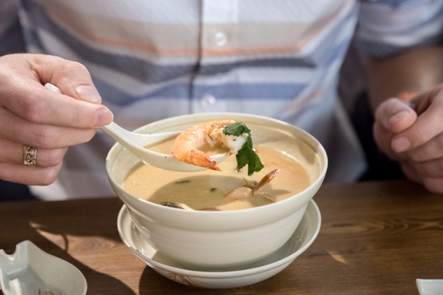 Извините, я несколько забежал вперёд. Первым принесли «японское ассорти», и если коротко, это вам не суши из службы доставки, которые везут через весь город. Это хороший продукт, за который не жалко отдать деньги. Что касается Том-Яма - суп оказался очень даже хорош. По-европейски острый (уровень «ноу спайси» в туристической зоне Таиланда), богатый на наполнители (тут тебе креветки, кальмар, грибы и прочие составляющие) и с обязательной порцией риса, чтоб перебить непривычную для нашего желудка остроту.