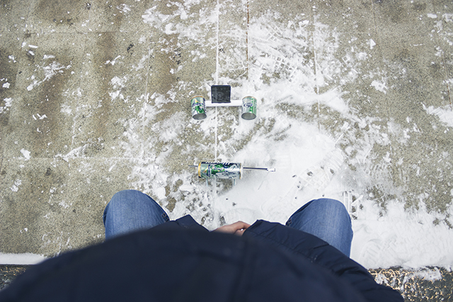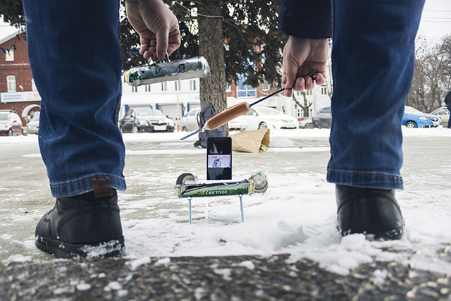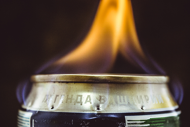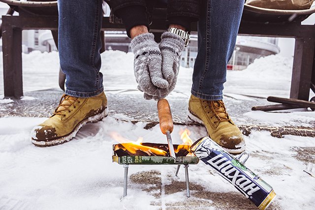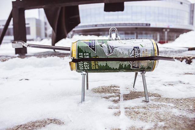 Сегодня выпал снег, поэтому мне понадобится обогреватель воздуха. Он делается очень просто: из одной банки, металлической мочалки и спирта. На таком ветру и холоде спирт почему-то не загорелся, наверное, потому что старый, поэтому я налил в банку жидкость для розжига. Пламя получилось знатное, но ненадолго. В идеале, от спирта мочалка должна накалиться и играть роль нагревательного элемента – от такой «батареи» можно долго греть руки на холоде.