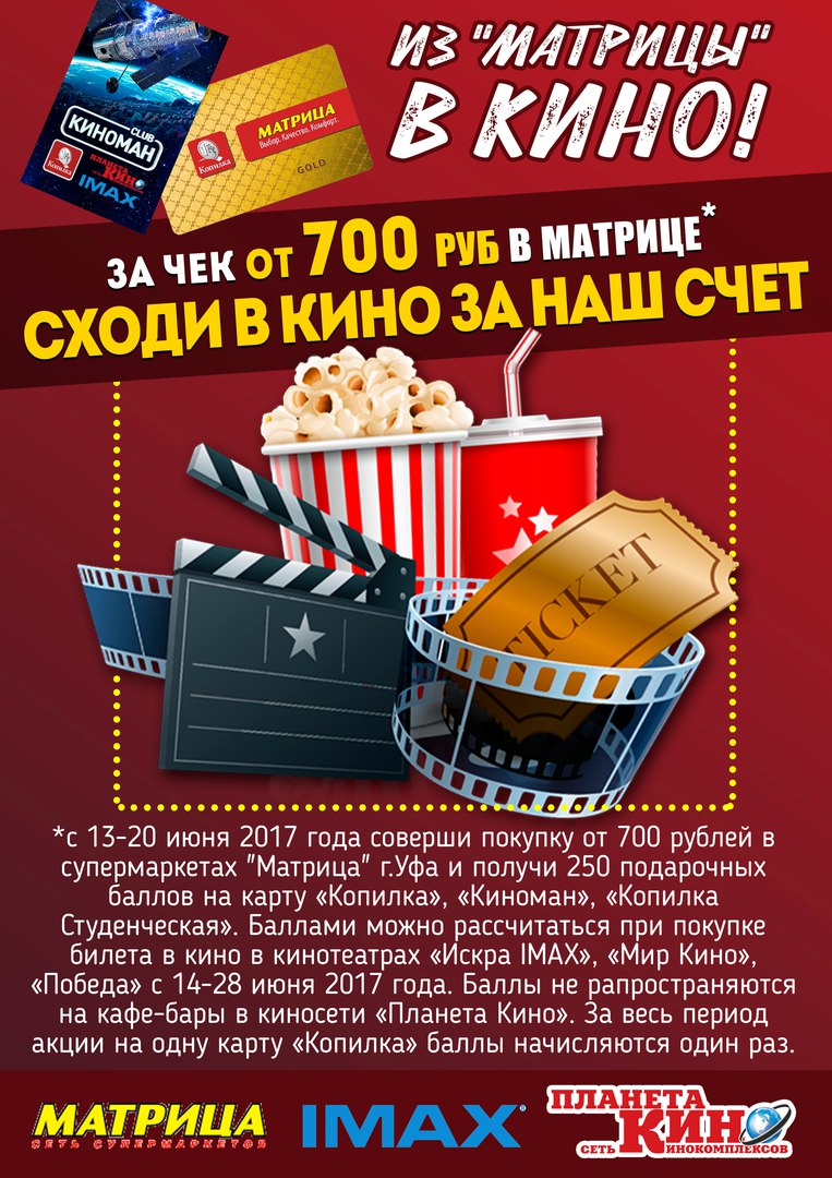 Для этого достаточно совершить покупку в магазинах от 700 рублей и воспользоваться картой «Копилка». 250 баллов, которые поступят на счёт бонусной карты, можно потратить на билеты в кинотеатрах «Искра IMAX», «Мир Кино» и «Победа» с 14 по 28 июня. Отметим, что за весь период акции баллы начисляются только один раз на одну карту «Копилка».